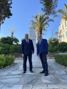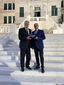 Ο πρόεδρος της ΕΒΑΤ Ιωάννης Γκιάλας με τον πρόεδρο του ΦΟΒ Στείρο Πολύδωρο, στην τελετή απονομής μεταλλείων στους ιστιοπλοϊκού αγώνες Παστρικάκεια 2023, στη Σχολη Ναυτικων δοκίμων.